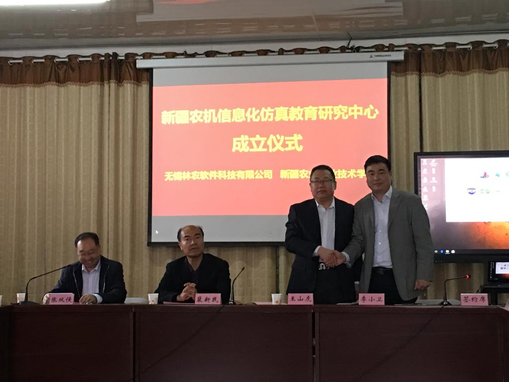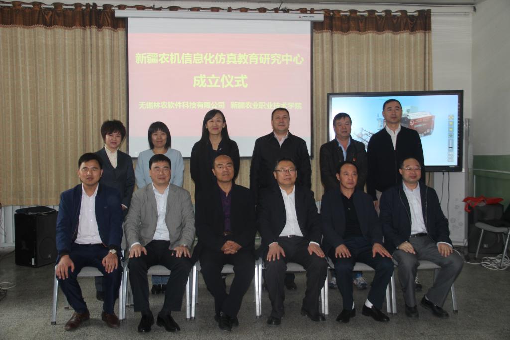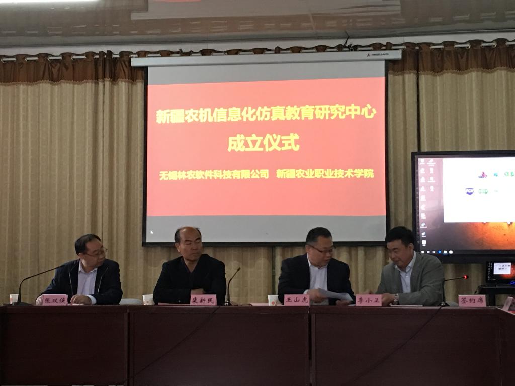 2018年5月7日上午11:00, 新疆农机信息化仿真教育研究中心成立仪式在屯河校区图书馆二楼会议室举行。参加此次大会的有:自治区农牧业机械管理局党组成员、总工程师裴新民,新疆农业职业技术学院党委委员、副院长王山虎,自治区农牧业机械管理局科教处副处长毕惠英,技术推广总站站长吐尔洪·吐尔地 ,信息管理中心主任忽晓葵,无锡林农软件科技有限公司董事长李小卫,新疆牧丰伟业机械制造有限公司总经理李德义,新疆恒晟建材检验有限责任公司董事长岳利勇,农业工程分院院长张双侠,副院长何玉忠及全体教师。