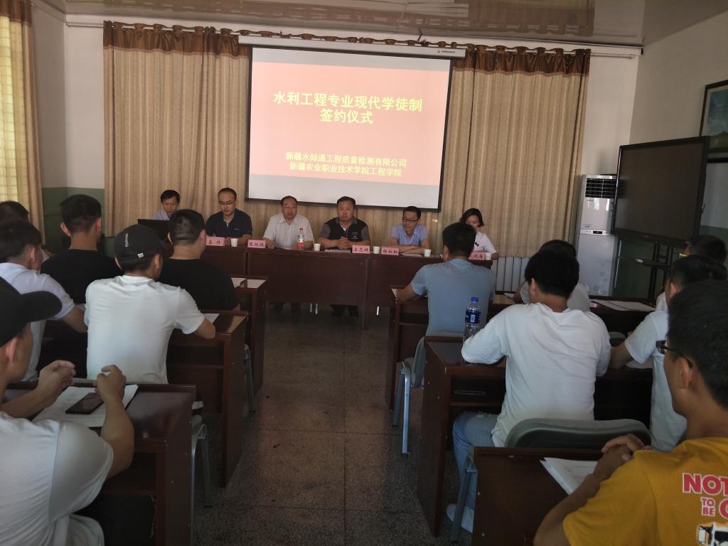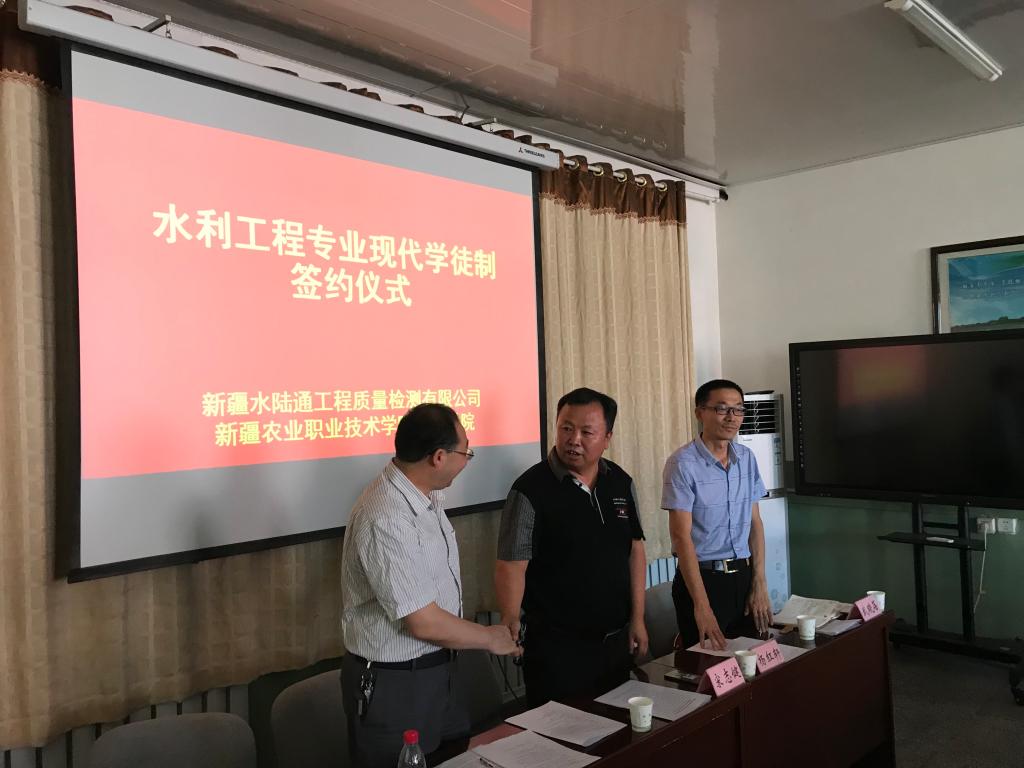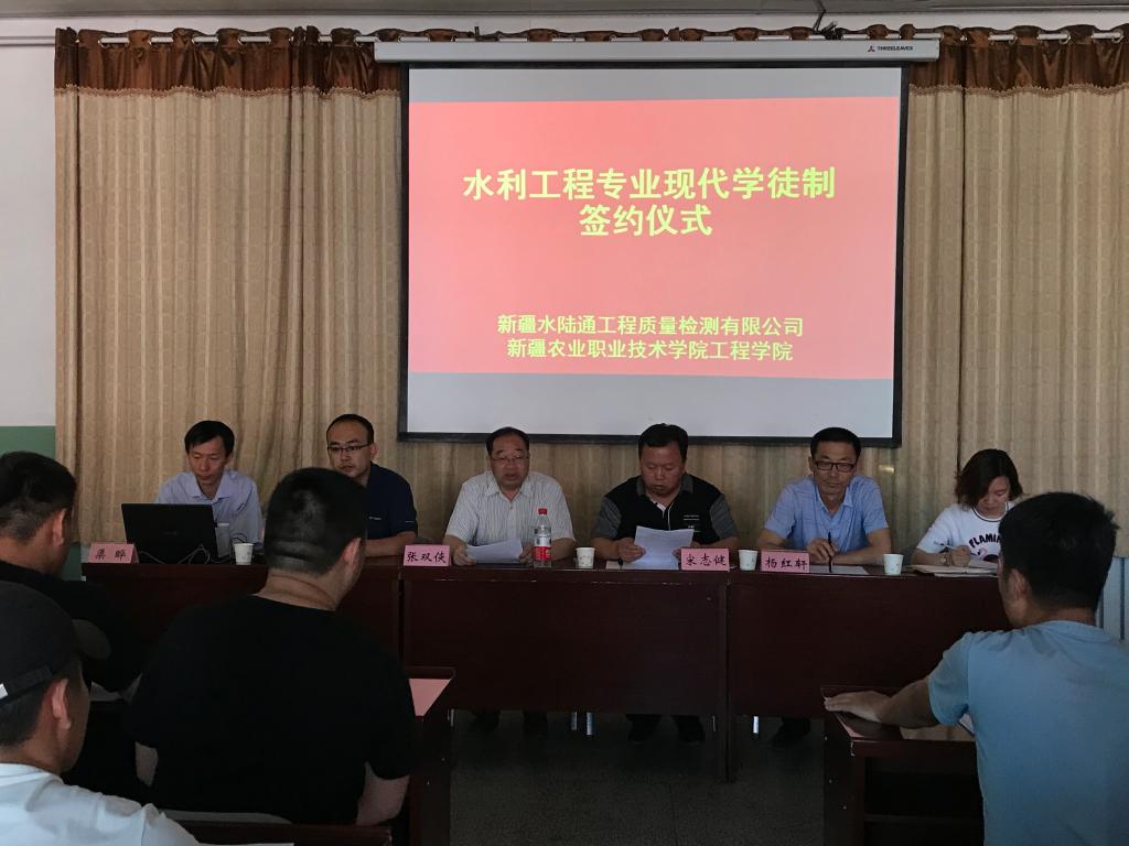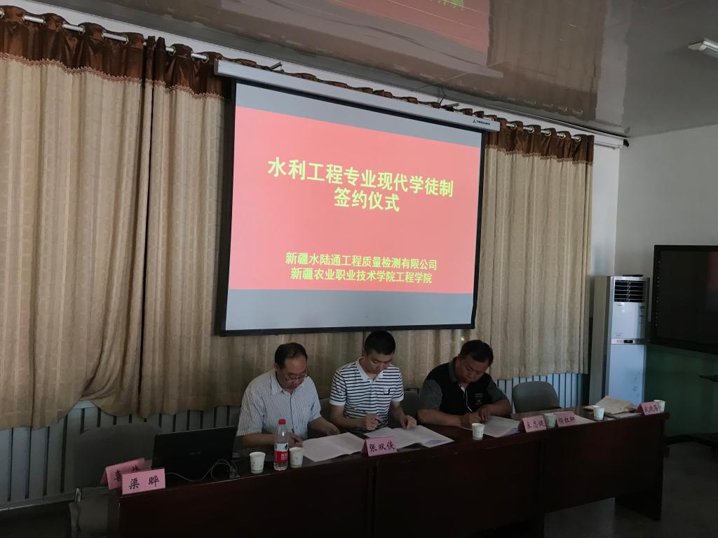 2018年6月5日, “水利工程专业现代学徒制签约仪式”在屯河校区永清楼一楼会议室召开,来自新疆水陆通工程质量检测有限公司总经理宋志健,技术总负责人杨红轩,工程学院院长张双侠及水利工程学徒制班的师生欢聚一堂。